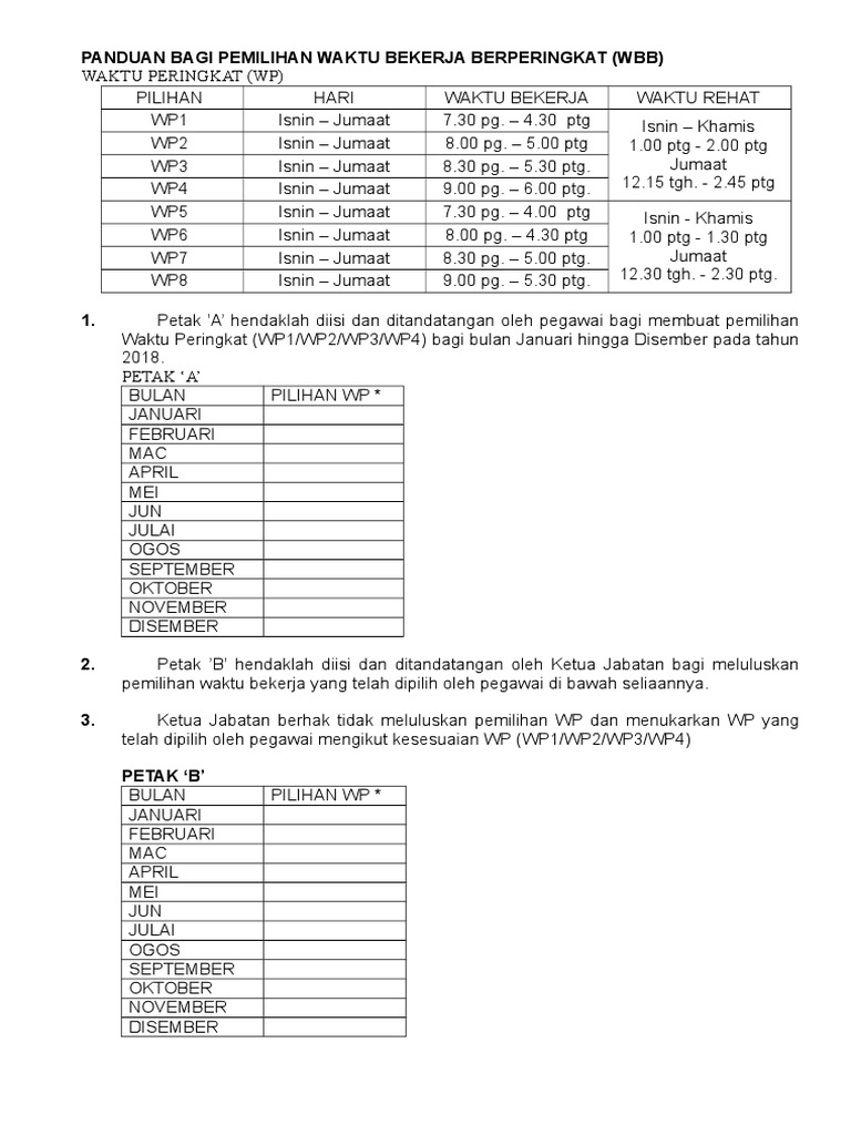 Wbf hendaklah dilaksanakan berdasarkan waktu bekerja sehari iaitu selama sembilan jam termasuk waktu rehat sejam. Bermula 7.30 hingga 9 pagi. Tuan/puan adalah dikehendaki membuat pilihan waktu bekerja berperingkat (wbb) mengikut waktu peringkat (wp1, wp2, wp3) bagi bulan januari hingga disember tahun …………. Bayaran khas aidilfitri tahun 2018. Borang pertukaran waktu bekerja berperingkat (wbb) bagi bulan ramadan mpob.